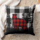 A White and black buffalo plaid winter decor pillow featuring a red bufaflo plaid bear in a quiet woodland pine tree forest, with a white and black buffalo plaid background.