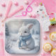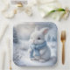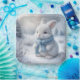 A fluffy white rabbit wearing a blue scarf sits in a snowy winter wonderland, surrounded by frost-covered plants and evergreen trees.