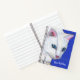 This spiral notebook is deep vibrant blue with tiny white faux sparkles and a the head of a white cat with bright blue eyes. Customise your text with the template.