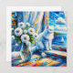 Ai art depiction of a a white cat looking out the window at a sailboat on the ocean. In front of the cat is a glass vase of white flowers. This is done in a oil painting style. Pretty coastal art for beach home or to give you that ocean breeze feeling.