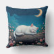 A serene white cat rests on a log adorned with flowers beneath a crescent moonlit sky. The tranquil night setting conveys peace, beauty, and the charm of nature.