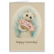 Greeting card inspired by a watercolor by British 'cat artist' Louis Wain. The picture shows a smiling white cat cooling herself(?) with a pink fan, decorated with red flowers.
