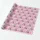 Pretty white cat with green eyes tangled in pink ribbons on a pink background and a white border.