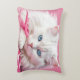 Beautiful white cat with blue eyes and tangled pink ribbons on pink.