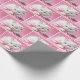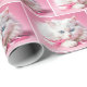 Beautiful white cat with blue eyes and tangled pink ribbons on pink.