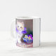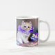 Coffee Mug featuring a gorgeous white kitten! A fluffy kitten wears a purple flower collar. A blue bowl of white and purple flowers sits to the right. A marvellous gift for cat lovers and Victorian art enthusiasts!
