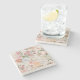 The coasters are gorgeous, a quality feel and heavy weight. They look like a precious archeological find. A rustic stone juxtaposed with a modern floral black and white print. I like the way the print goes slightly imperfect on the cut stone edges giving them a kind-of natural beauty.