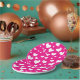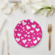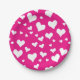 Paper plates in a pattern of scattered, chalk sketch effect, white hearts, on a deep fuchsia pink background