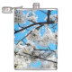 Flask with white cherry blossoms photographed against a clear, blue sky.