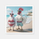 A whimsical scene shows two anthropomorphic white chickens dressed in beachwear and sunglasses on a beach.