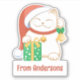 Smiling white cat in a traditional red Christmas hat holding a large wrapped present is wishing everyone a very merry Christmas! In its left paw the cat is holding high a golden bell with a green bow. Customisable text.