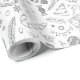 vector white winter christmas doodle seamless pattern with ornaments, santas sock, mitten, beard, pine tree, candy cane, lollipop, bow, candies, stars, christmas tree lights, presents. christmas wrapping paper.