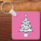 An illustration of an elegant chic white Christmas tree with plenty of blue hanging balls in pink background. This design is for people who loves Christmas, giving gifts and giveaways.