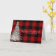 White Christmas pine tree with gold bells and bird wearing winter scarf on red and black lumberjack plaid for Merry Christmas and happy new year