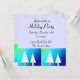 A soft modern design featuring a blue green background with white Christmas trees with little blue ornaments. A soft icey blue background with black font. Customise with all of your party information as desired.