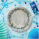 Christmas trees embellished with white snow and a festive red and green circle wreath.