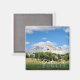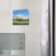 Souvenir photo magnet of a landscape in Puglia, Italy, with the white city (citta bianca) Ostuni on a hill above an olive tree orchard under a cloudy sky with the text: 'Ostuni, Puglia'.