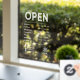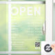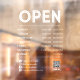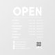 Practical and modern opening hours business decal in white for your store windows or store door with opening hours per day, your phone number, social media and website next to white icons, and a QR code your customers and clients can scan for easy access to your online presence. All text is customisable.