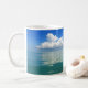 Start your day off right with our coffee mug with a relaxing scenic painting of a fluffy white cloud in a clear blue sky reflected in a calm turquoise ocean.