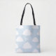White Clouds Pattern Personalised Light Blue Tote Bag. Cute and whimsical all over print tote bag featured white clouds on light blue background. This tote bag can be personalised, perfect as a baby shower favour bags or as a gift.