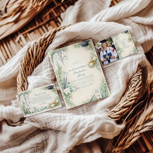 This elegant dentist graduation design features a soft botanical frame paired with dental symbols such as a white coat, dental tools, diploma scroll, and smiling tooth illustration. The calm green and ivory palette creates a polished yet welcoming look, perfect for celebrating dental school graduation, white coat milestones, or a dentist’s professional achievement. Fully customizable with names, dates, and event details.