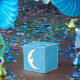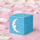This party favour box is blue covered with tiny white open stars and a white crescent moon with an elegant face on the front panel. Customise your text on the top of the box with the template.