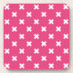 White cross stitches on fuchsia coaster