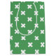 White cross stitches on green medium gift bag