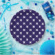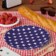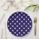 White cross stitches on navy blue paper plate