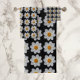 Bath towel set that features a photo image of a white Dahlia flower with yellow centre on a black background and printed in a repeating pattern. A lovely, floral design! Order towels separately or as a set.