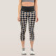 High-waist, stretchy capri leggings that feature the photo image of a simple, white Dahlia flower with yellow centre on a black background and printed in a repeating pattern. A lovely, floral design! Waist panel is black. Select your leggings size.
