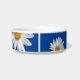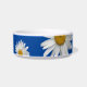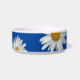 Cute floral pet bowl, with a white daisies design on a blue background. With white customisable lettering, you can add your own information. Great for giving your special pet their own personalised bowl.