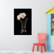 A photograph of beautiful white daisies with yellow centres in a glass vase against a solid black background.
