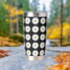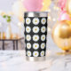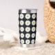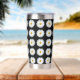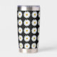 A trendy, stainless steel, thermal tumbler for your hot or cold drinks that features the photo image of a pretty, white Daisy flower printed in a repeating pattern on a black background. A fun, floral design!