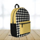 Travel with this stylish and trendy backpack that features the image of a white Daisy flower with yellow centre on a black background and printed in a tiled pattern on front side only. A fun, floral design! Top and zippered pouch of backpack are a solid yellow colour. Sides and back are black. You may customise your backpack colours as desired.