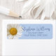 A pretty return address label with a white daisy and a combination of script and simple sans serif font on light blue background.