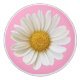A close-up photo of a white daisy flower with yellow centre on pink background.