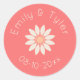 Add a touch of colour to even the tiniest details of your wedding! Personalise this sticker with your names and wedding date or with a romantic sentiment of your choice - such as "Together Forever" - and then add it to your invitation envelopes, favour bags, or wherever else you wish. The off-white flower and text against the deep red-orange coral background, along with the delicate font, add a whollop of cheery, romantic style in a tiny package.