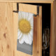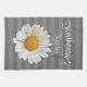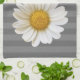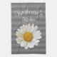 A close-up photo of a beautiful white daisy flower with custom name on grey striped background.