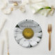 Personalise the pretty White Daisy Petals Wedding Paper Disposable Plates with the names of the bride and groom and marriage ceremony date. These elegant custom botanical wedding paper plates feature a digitally painted floral photograph of a white daisy flower blossom with a yellow centre. Suitable for a classy white flowery or daisy engagement party, bridal shower or wedding theme.