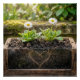 Two summer daisy plants thrive in a glass flower box on a patio in sunlight, their roots intertwined in a heart shape.