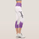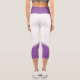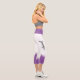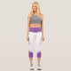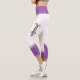 These white and purple stylish workout leggings feature an elegant white floral design on a dark lavender background on the waistband and on the legs with white stripes.