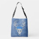 This all over print body cross over bag is a mix of shades of blue and white with a white deer head with antlers and blue eyes with three big blue roses on the top of its head on the front and back.