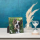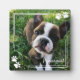 Square photo plaque with your dog photos inside a sketched frame in white with paw prints. Dog photo plaque personalised with your puppy's name.