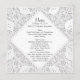 Chic square wedding reception menu, with graphics of a lacy doily look. A diamond shaped text area, in the middle, black text ready to personalise, for your special day.
