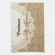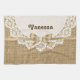 White doily with lace and linen natural burlap design that features a white round doily with lace on linen natural burlap with ribbon and bow in beige with metallic effect and a white jewel. Text in brown. Note that lace, burlap, flower and jewel are all “printed on” and not real fabric, metal, gem or crystal. This elegant, sophisticated and romantic design with a rustic essence is fully customisable and can be personalised.