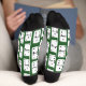 Simple hand-drawn style illustrations of dominoes in white with black printing or dots on them are arranged in a pattern against a green background on these novelty socks. They're perfect for anyone who loves playing dominoes and other games.