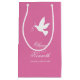 Give your wedding gifts in this special wedding gift bag personalised with your bride and grooms name. Perfect to add a personalised touch to your wedding gifts to your wedding party or when giving wine. A simple graphic dove outline with two pink ribbons art gift bag in white and pink. Matches a range of other wedding products in the dove range. Customise / personalise these gift bags with your own bride and grooms names and wedding date on both sides. Original art and design by Sarah Trett.