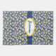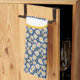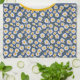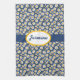 Cute, little, white daisies with bright yellow centres on a blue background creates a simple and sweet kitchen towel. Personalise with your name in a yellow-bordered oval held by a dark blue band.