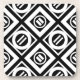 Bold geometric pattern features alternating thick and thin white diamonds with space between them on a black background. The thick diamonds each contain a thin white circle with a thick white equal sign at an angle inside. In contrast, the thin diamonds each contain a thick white circle that touches its edges with a thin tilted white equal sign inside.